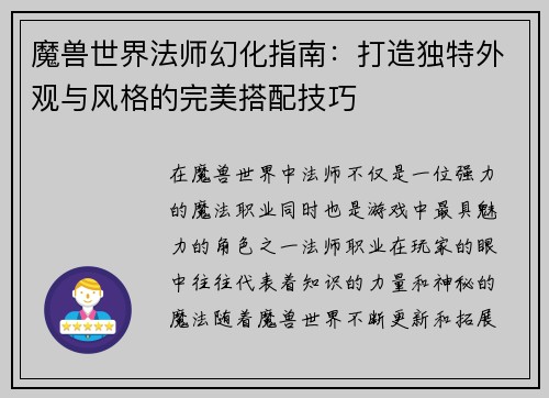魔兽世界法师幻化指南:打造独特外观与风格的完美搭配技巧
